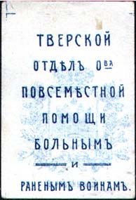 1916(?) г.   Разм. 32 х 49 мм. Одноцветная двухсторонняя печать на бумаге различных цветов. На лицевой стороне в центре различные сюжеты. По перимет-ру текст: «Жертвуйте на теплую одежду и белье нашим защитникам». На оборотной стороне текст в семь строк: «Тверской отдел О-ва Повсеместной Помощи Больным и Раненым Воинам».