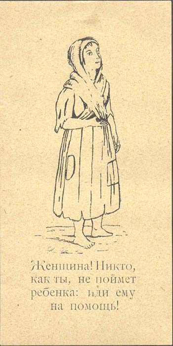 | В центре девочка-беспризорница. Внизу текст в четыре строки: «Женщина! Никто как ты, не поймет ребенка: иди ему на помощь!». | |||||