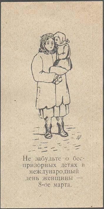 | В центре женщина с ребенком на руках. Внизу текст в пять строк: «Не забудьте о беспризорных детях в международный день женщины – 8-ое марта». | |||||