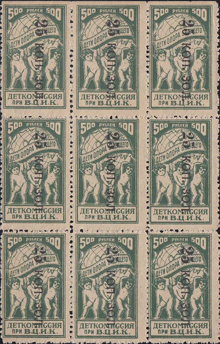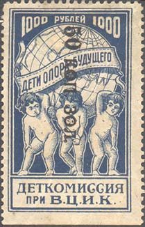 1924 г. Второй вспомогательный выпуск. Черная типографская надпечатки нового номинала на марках первого всесоюзного выпуска Деткомиссии при ВЦИК.