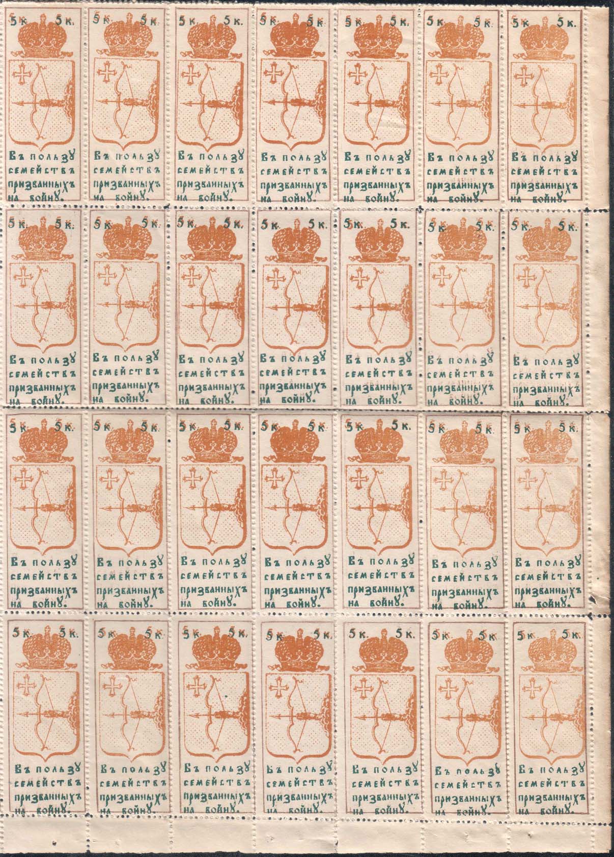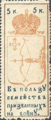 1915 г. Разм. рамки 25 х 64 мм. Двухцветная и трехцветная печать на белой бумаге. Зубц. 11 1/2. С клеем. В прямоугольной рамке в центре герб Вятской губернии. Сверху в углах номинал. Внизу текст в четыре строки: «В пользу семейств призванных на войну».