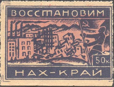 1931 г. Всероссийский сбор. Разм. рамки 39 х 24 мм. Одноцветная и двухцветная печать на кремовой (оттенки) бумаге. Нерегулярная зубц. В двойной прямоугольной рамке в центре разрушенный землетрясением город. Справа силуэт человека со знаменем с серпом и молотом и номинал в прямоугольной рамке. Сверху текст: «Восстановим». Внизу продолжение текста: «Нах-край».