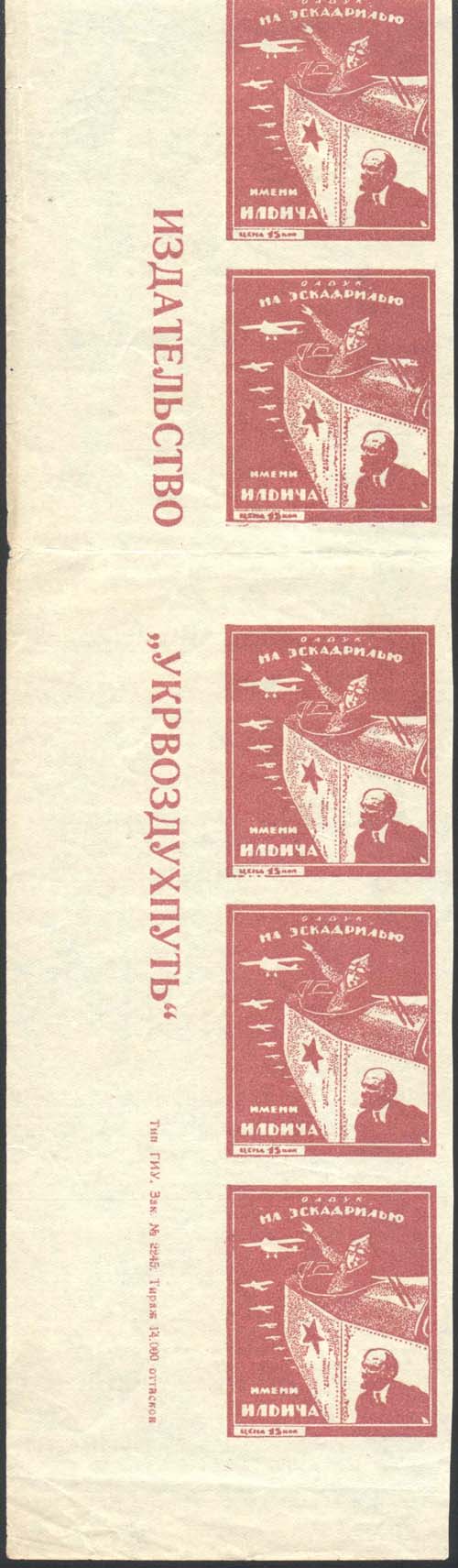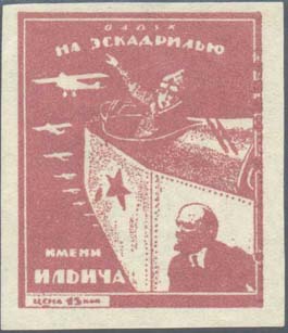 1924 г. Разм. рамки 38 х 45 мм. Одноцветная печать на белой бумаге. Зубц. 11 1/2. И Б.З. В рамке различные рисунки. Текст: «ОАВУК на эскадрилью имени Ильича». В левом нижнем углу номинал.