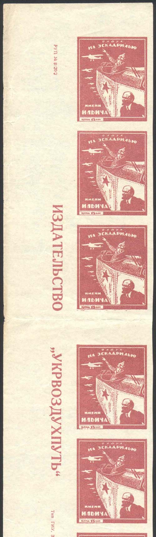 | Примечание: Примечание(я): 1. Марки данного выпуска печатались в листах, содержащих 36(6 х 6) шт. марок. 2. Слева на полях листа выходные данные: «РУП № 81202 Издательство «Укрвоздухпуть» Тип. ГИУ. Зак № 2245. Тираж 14.000 оттисков». 3. Как видно из выходных данных, тираж марок номиналом 15 к. составляет 504.000 шт. | |||||||
