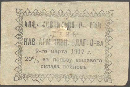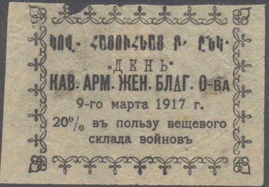 1917 г. 09.03.1917 г. Разм. рамки 54 х 41 мм. Одноцветная печать на тонкой желто-серой бумаге. В декоративной прямоугольной рамке сверху текст на армянском языке. В центре текст в две строки: ««День» Кав[казского]. Арм[янского]. Жен[ского]. Благо[отворительного]. О-ва». Ниже тест в три строки: «9-го марта 1917 г. 20% в пользу вещевого склада воинов».