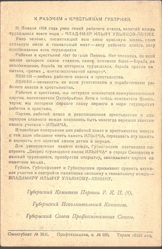 1924 г.   Листок разм. 90 х 131 мм. Одноцветная двух-сторонняя печать на толстой кремовой бумаге. На лицевой стороне в двойной прямоугольной рамке разм. 80 х 121 мм сверху на фоне здания с колоннами очередь из людей с кирпичами. В левом верхнем углу на фоне знамени  в двойной круглой рамке диаметром 21 мм портрет В.И. Ленина. Сверху облака и лучи солнца. Внизу в отдельной прямоугольной рамке Текст в четыре строки: «Кирпич на постройку памятника В.И.Ленину в Смоленске». Внизу серп и молот. В правом нижнем углу в овальной рамке номинал. Внизу под рамкой мелким шрифтом: «Смоленск, А.Кажура. Типо-Литография им. Смирнова». На оборотной стороне в тридцать три строки текст обращения к рабочим и крестьянам Смоленской губернии Губернского Комитета Партии Р.К.П.(б), Губернского Исполнительного Комитета и Губернского Совета Профессиональных Союзов. Внизу под горизонтальной чертой мелким шрифтом выходные данные: «Смолгублит №3881. Профтехшкола, з. № 885, Тираж 18000 экз.».