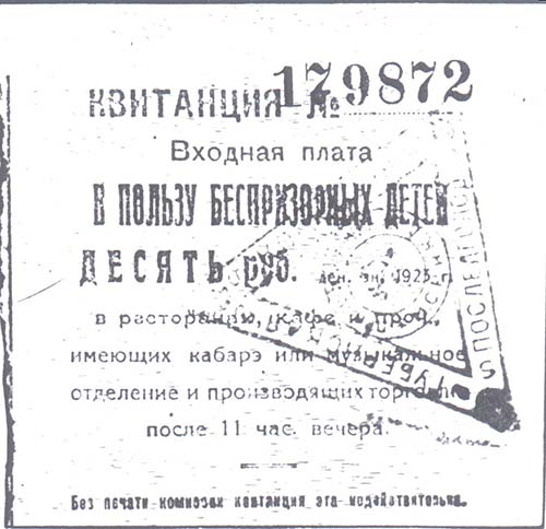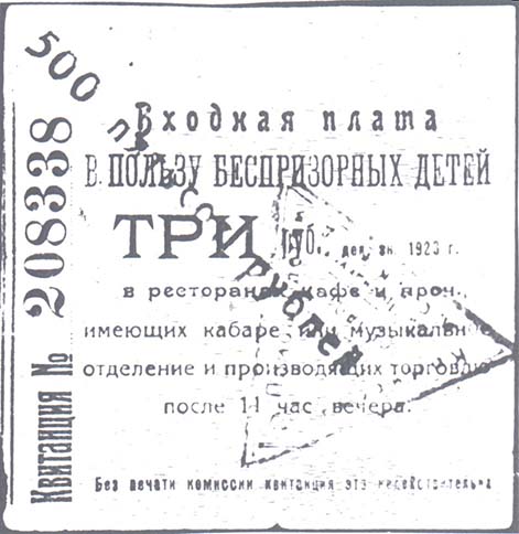 1923 г. Разм. 85 х 81 мм. Одноцветна печать на желтоватой бумаге низкого качества. Левосторонняя зубц. 11 1/2. Текст в восемь строк: «Входная плата в пользу беспризорных детей ... (номинал) ден. зн. 1923 г. в ресторанах, кафе и проч[их]., имеющих кабаре или музыкальное отделение и производящих торговлю после 11 час[ов]. вечера. Без печати комиссии квитанция не действительна».