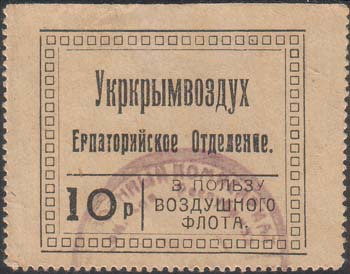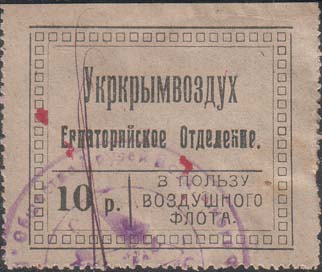 1923 г. Разм. рамки 45 х 35 мм. Одноцветная печать на бумаге различных цветов. Зубц. 11 1/2. В двой-ной рамке прямоугольной декоративной рамке сверху текст в две строки: «Укркрымвоздух Евпаторийское Отделение». Слева внизу номинал. Справа внизу текст в три строки: «В пользу Воздушного флота».