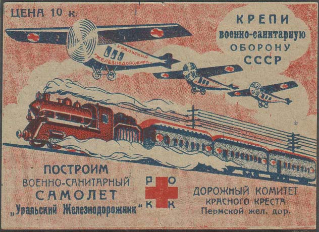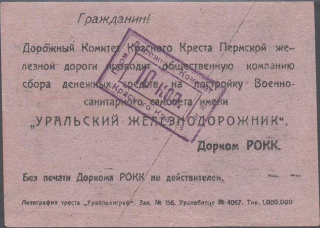 1931 г.   Листок разм. 106 х 75 мм. Трехцветная двухсторонняя печать на бумаге различных цветов. На лицевой стороне в центре санитарный поезд и три санитарных самолета. На самолетах надпись: «Уральский железнодорожник». В правом верхнем углу текст в четыре строки: «Крепи военно-санитарную оборону СССР». Внизу в центре красный крест и аббревиатура «РОКК». Слева внизу текст в четыре строки: «Построим военно-санитарный самолет «Уральский Желез-нодорожник»». Справа внизу текст в три строки: «Дорожный комитет Красного Креста Пермской жел[езной]. Дор[оги].». На оборотной стороне текст в восемь строк: «Граждане! Дорожный Комитет Красного Креста Пермской железной дороги проводит общественную компанию сбора денежных средств на постройку Военно-санитарного самолета имени «Уральский железнодорожник». Дорком РОКК. Без печати Доркома РОКК не действителен». Внизу выходные данные мелким шрифтом: «Литография треста «Уралполиграф». Зак. №156. Уралоблит №4067. Тир. 1.000.000».