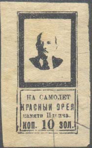 | В прямоугольной рамке разм. 21 х 41 мм в центре портрет В.И.Ленина. Внизу текст в три строки: «На самолет «Красный Орел» памяти Ильича». Ниже номинал. | |||||