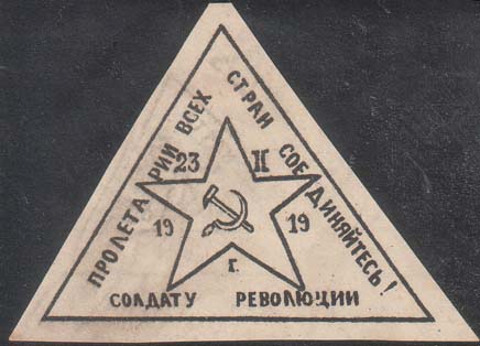1919 г. 23.02.1919 г. Виньетка в форме треугольника разм. рамки 61 х 45 мм. Трехцветная печать на бумаге различных цветов. В центре красная звезда с серпом и молотом. Между лучами звезды дата: «23.II.1919 г». По периметру рамки текст: «Пролетарии всех стран соединяйтесь! Солдату революции».