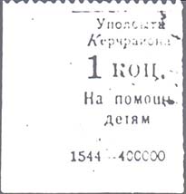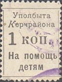 1926(?) г. Разм. рамки 19 х 23,5 мм. Одноцветная печать на бумаге различных цветов и качества. Зубц. 11 1/2. В центре в прямоугольной рамке номи-нал. Сверху текст в две строки: «Уполбыта Керчьрайона». Внизу текст в две строки: «На помощь детям». На лицевой стороне фрагменты оттисков круглых контрольных печатей.