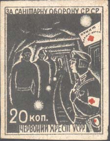 Разм. рамки 41 х 54 мм. Шахтеры и санитар в шахте. Сверху текст на украинском языке: «За санитарную оборону СССР». Внизу номинал и текст на украинском языке: «Красный Крест У.С.С.Р.».