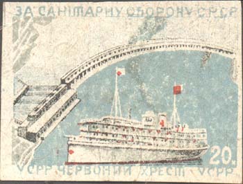 Разм. рамки 54 х 40 мм. В прямоугольной рамке в центре Днепрогэс и санитарный теплоход. Сверху текст на украинском языке: «За санитарную оборону СССР». В правом нижнем углу номинал. Внизу текст на украинском языке: «У.С.С.Р. Красный Крест У.С.С.Р.».