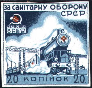 Разм. рамки 45 х 46 мм. В прямоугольной рамке в центре санитарный поезд. На заднем плане индустриальный пейзаж. Сверху текст на украинском языке: «За санитарную оборону СССР». Слева сверху серп и молот на фоне красного креста и текст на украинском языке: «Красный Крест У.С.С.Р.». Внизу номинал.