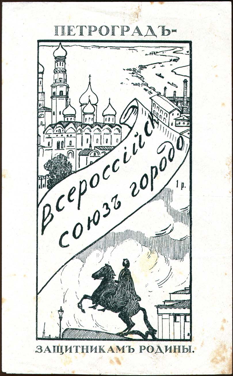 1916 г. Листок разм. 138 х 223 мм. Одноцветная печать на сероватой бумаге. В рамке Московский Кремль и Памятник Петру I в Санкт-Петербурге и лента с текстом: «Всероссийский Союз городов». Текст: «Петроград – Защитникам Родины». В рамке в центре справа номинал.