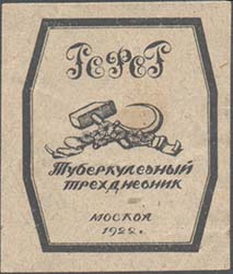 1922 г. Одноцветная и двухцветная печать на бумаге различных цветов. В центре в двойной восьмиугольной рамке разм. 35 х 42 мм. серп и молот, лента и цветы ромашки. Сверху аббревиатура «РСФСР». Внизу текст в четыре строки: «Туберкулезный трехдневник. Москва 1922 г.»