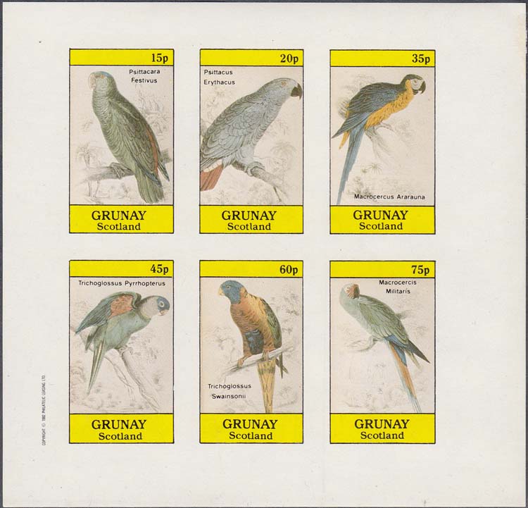 1982 г. Разм. 25 х 44 мм. Многоцветная печать на белой глянцевой бумаге. Зубц. 10 3/4. и Б.З. С клеем. В центре в прямоугольной рамке птицы различных видов и пояснительный текст на английском языке. В правом верхнем углу номинал. Внизу текст на английском языке: "Grunay Scotland".