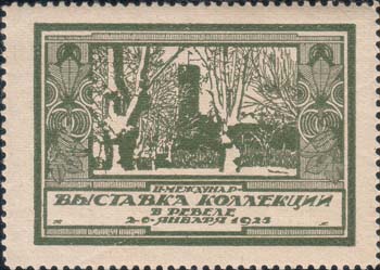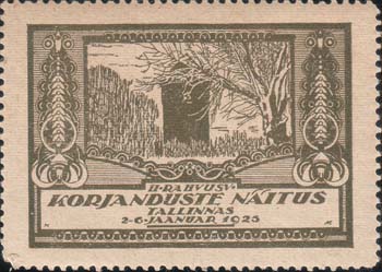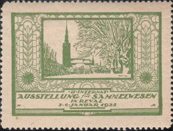 1925 г. 02.01.1925 г. Разм. рамки 51 х 34,5 мм. Одноцветная печать на белой бумаге. Зубц. 11 3/4. С клеем. В прямоугольной декоративной рамке в центре различные сюжеты. Внизу текст в четыре строки на разных языках: «II Международная выставка коллекций в Ревеле. 2-6 января 1925 г.».