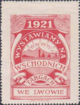 1921 г. 29.09.-05.10.1921 г. Разм. рис. 35 х 49 мм. Одноцветная печать на белой бумаге. Зубц. 11 1/2. С клеем. В декоративной рамке в центре городские постройки на фоне восходящего солнца. Сверху даты проведения выставки: «25.IX 5.X. 1921», Текст на разных языках: «Примите участие в Восточной ярмарке во Львове». Под рамкой выходные данные мелким шрифтом на польском языке: ««Karpalit» 3 p. Akc. Lwow».