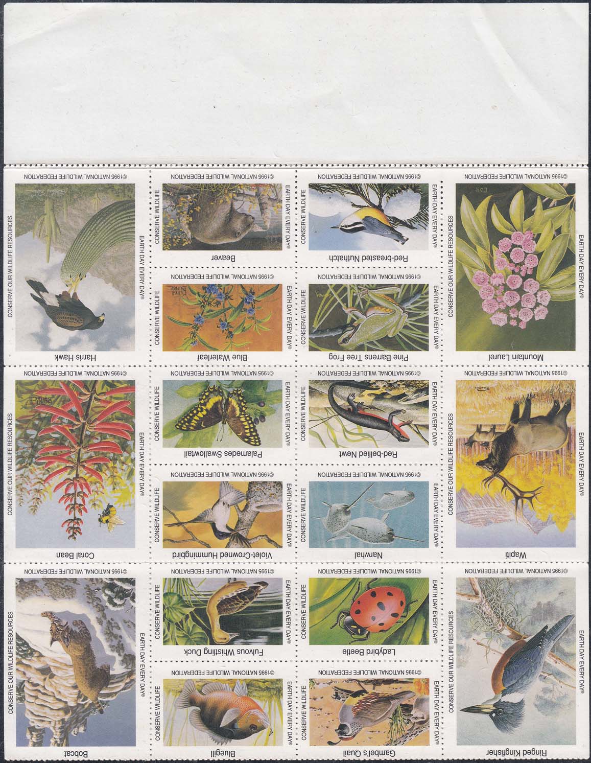 1995 г. Разм. рис. 40 х 22 и 40 х 55 мм. Многоцветная печать на белой глянцевой бумаге. Зубц. 11 1/2. С клеем. В центре изображения животных различных видов. По внешнем периметру рамки тексты на английском языке.