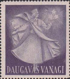 1948 г. Разм. рис. 34 х 39 мм. Одноцветная печать на белой бумаге. Зубц. 11 1/2. С клеем. В центре различные рисунки. Внизу текст на латышском языке: "Ястребы даугавы".