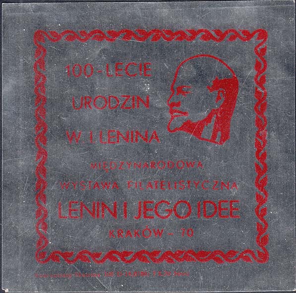 1970 г.   Одноцветная печать на серебристой фольгированной бумаге. В правом верхнем углу барельеф В.И. Ленина. Текст на польском языке "100 - летие со дня рождения В.И. Ленина. международная филателистическая выставка "Ленин и его идеи". Краков 1970". Внизу под рамкой выходные данные на польском языке.
