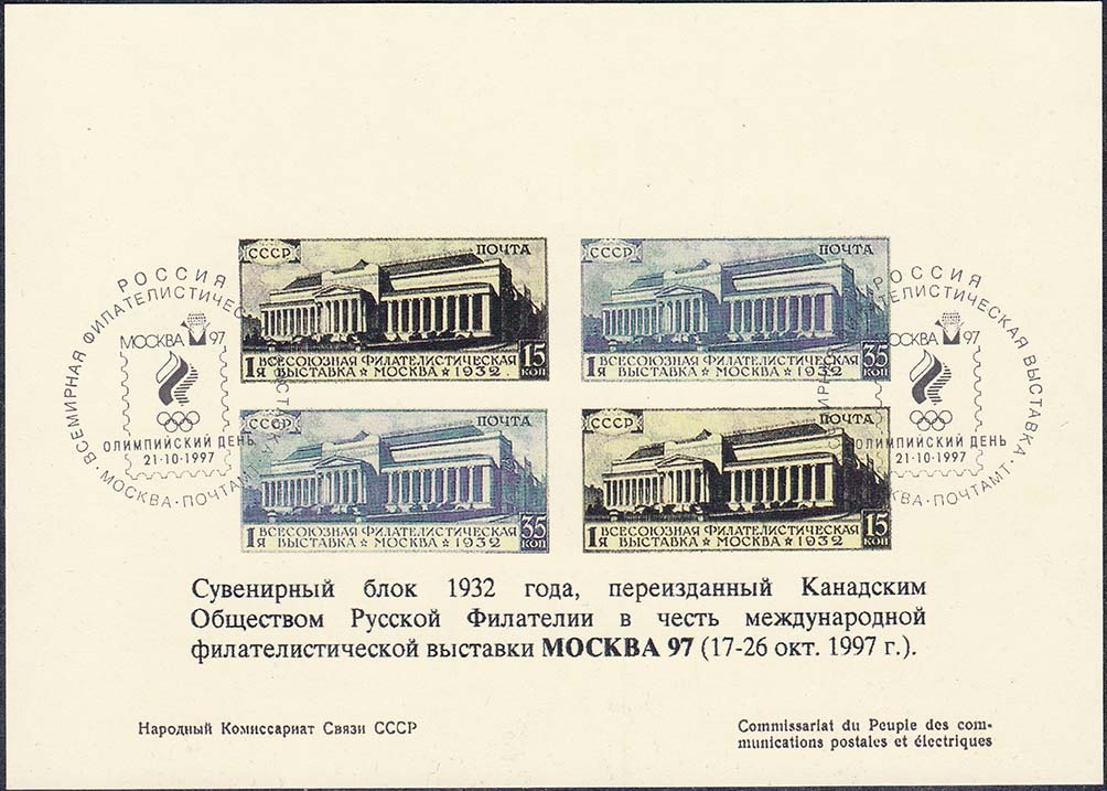 1997 г. Листок разм. 169 х 120 мм. Многоцветная двухсторонняя печать на плотной белой бумаге. На лицевой стороне четыре почтовых марки СССР, посвященных 1-й всесоюзной филателистической выставке 1932 года. На полях листка внизу текст в три строки: "Сувенирный блок 1932 года, переизданный Канадским Обществом Русской Филателии в честь международной филателистической выставки Москва 97 (17-26 окт. 1997 г.)". Внизу текст мелким шрифтом на русском и английском языках: "Народный Комиссариат Связи СССР". На оборотной стороне в центре текст в семь строк на английском языке. Внизу под чертой текст в две строки: "Печатник: Андрей Александрович Бороденко".