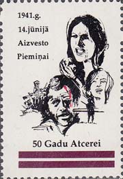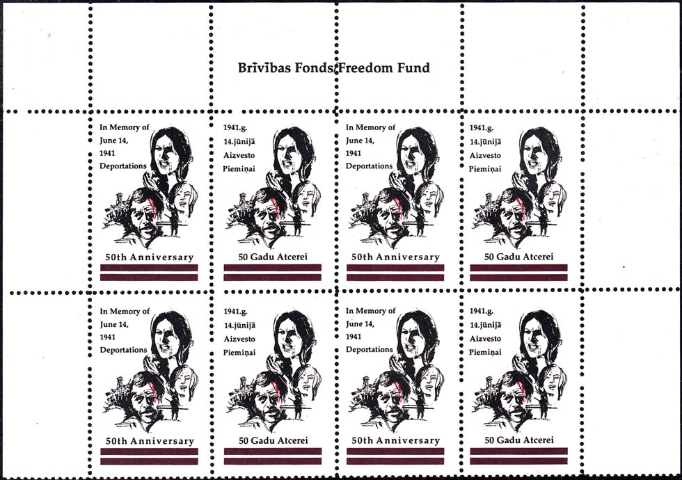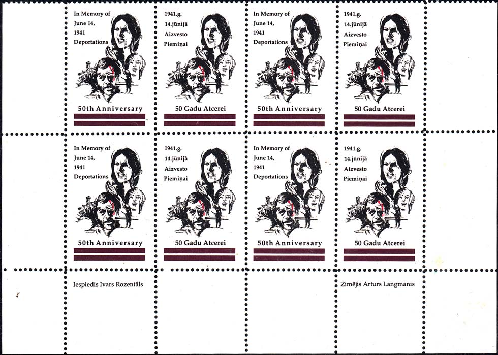 1991 г. Разм. по перфорации 31 х 44 мм. Двухцветная печать на белой глянцевой бумаге. Зубц. 11 3/4. Склеем. В центре жертвы репрессий. Текст на английском и латышском языках: "В память депортации 14 июня 1941 года. 50-я годовщина".