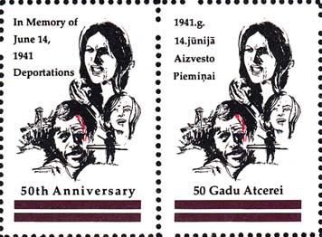 1991 г.   Разм. по перфорации 31 х 44 мм. Двухцветная печать на белой глянцевой бумаге. Зубц. 11 3/4. Склеем. В центре жертвы репрессий. Текст на английском и латышском языках: "В память депортации 14 июня 1941 года. 50-я годовщина".