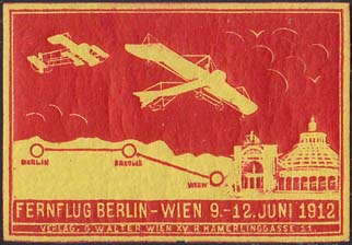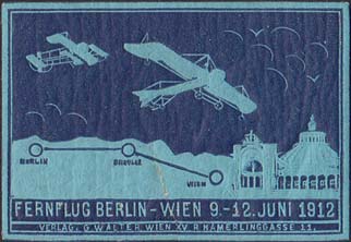 1912 г. Разм. рамки 52 х 35 мм. Двухцветная печать на белой бумаге с тиснением. С клеем. В прямоугольной рамке в небе два самолета над городскими постройками и карта перелета. Внизу текст на немецком языке: "Перелет Берлин -Вена 9-12 июля 1912". Внизу выходные данные на немецком языке.