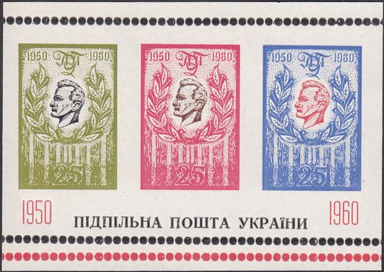 1960 г. К 10-летию сметри Р. Шухевича. Листок разм. 91 х 64 мм. Многоцветная печать на белой мелованной бумаге. В центре три мар-ки УПП с профилем Р. Шухевича. Внизу текст на украинском языке: «1950 Подпольная почта Украины. 1960».