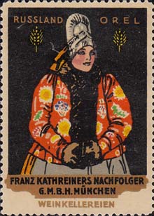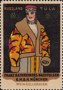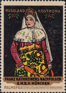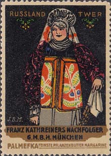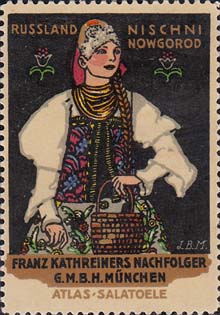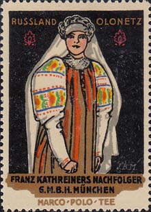 1913 г. Разм. по перфорации 37 х 52 мм. Многоцветная двухсторонняя печать на белой бумаге. Зубц. 11 1/2. На лицевой стороне на сплошном фоне женщины ы различных национальных костюмах. Сверху название региона на немецком языке. Внизу название фирмы и рекламируемого товара. На оборотной стороне в декоративной рамке разм. 33 х 45 мм описание рекламируемого товара.