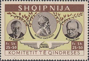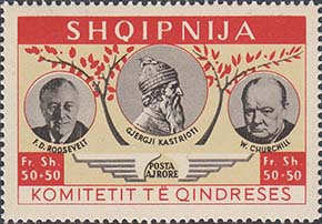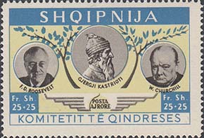 1951 г. Первый выпуск. Разм. рамки 44 х 38 мм. Многоцветная печать на белой бумаге. Зубц. 13 3/4. С клеем. В центре портреты Г. Кастриоти, Т. Рузвельта и У. Черчилля. Тексты на албанском языке и номинал.