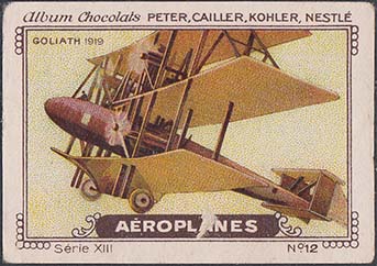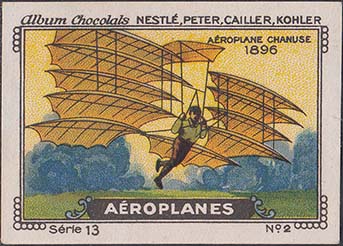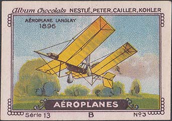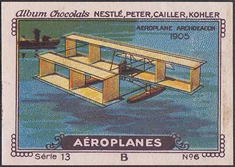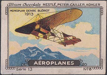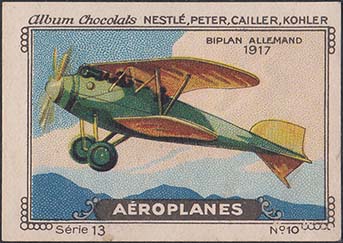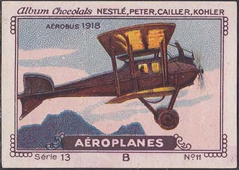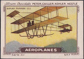 1914(?) г. Разм. рамки 51 х 33 мм. Многоцветная печать на белой бумаге. В двойной прямоугольной рамке в центре самолеты различных моделей с пояснительным текстом на французском языке.
