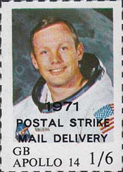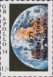 1971 г. Размер по просечке 31 х 43 мм. Многоцветная печать на белой глянцевой бумаге. Линейная просечка. С клеем. В центре различные рисунки на космические темы. тексты на английском языке и номинал.