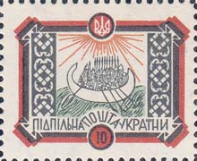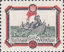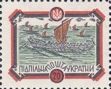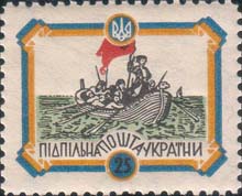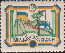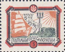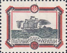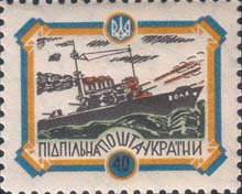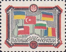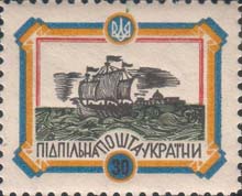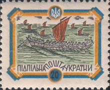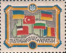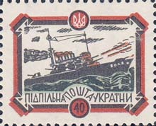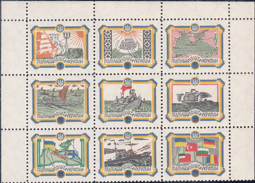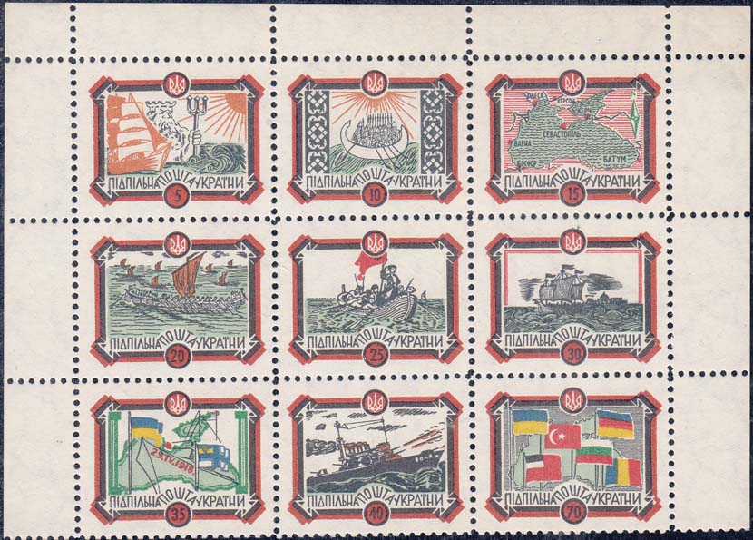 1953 г. Разм. рамки 33 х 25 мм. Многоцветная печать на белой бумаге с ВЗ. Зубц. Лиин. 10. С кле-ем. Выпуск в честь поднятия украинских флагов на судах черноморского флота. В прямоугольной декоративной рамке различные сюжеты.