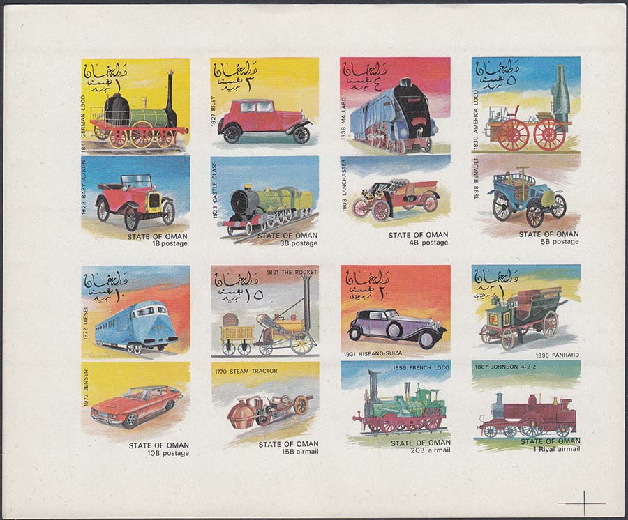 1970 г. Паровозы и автомобили. Разм. по перфорации 32 х 50 мм. Многоцветная печать на белой глянцевой бумаге. Зубц. 14. С клеем. В центре изображения различных автомобилей и паровозов.