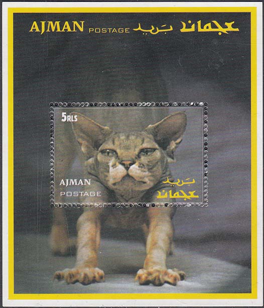 2000(?) г. Разм. рис. 84 х 99. Многоцветная печать на плотной белой глянцевой бумаге. Зубц. 13 1/2 низкого качества. В центре и на полях кошки различных пород. В левом верхнем углу номинал. Внизу название страны на английском и арабском языках.