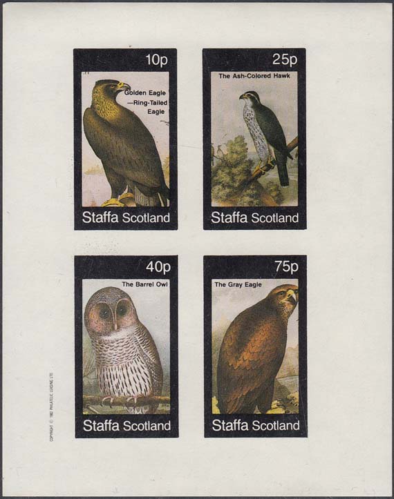 1982 г. Разм. рамки 25 х 44 мм. Многоцветная печать на белой бумаге. В прямоугольной рамке в центре птицы различных видов с пояснительными текстами на английском языке. В правом верхнем углу номинал. Внизу текст на английском языке: "Staffa Scotland".