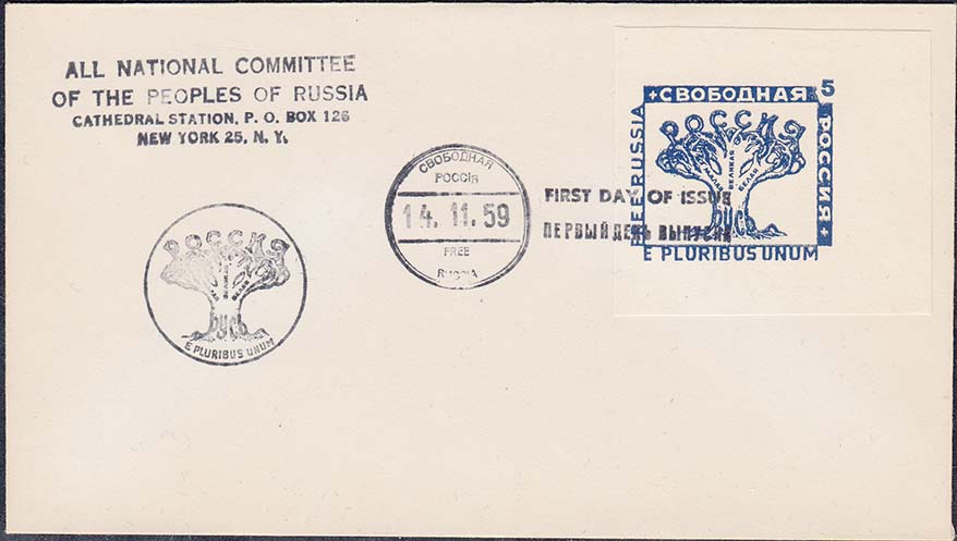 1959 г. 14.11.1959  Блок разм. 133 х 97 мм. Одноцветная печать на белой бумаге. С клеем. В центре четыре марки с аллегорическим изображениям России в виде дерева, номиналом и текстами на русском и английском языках.