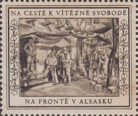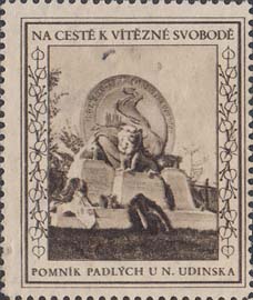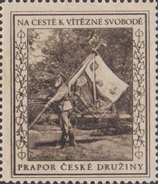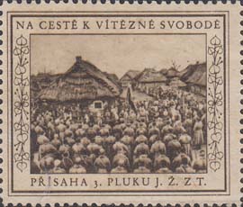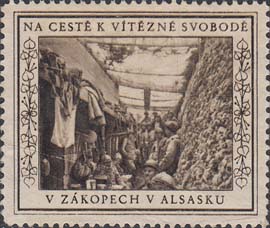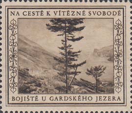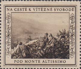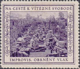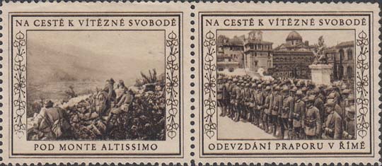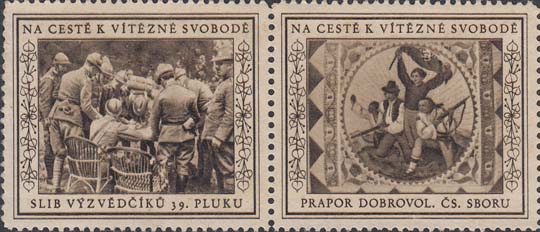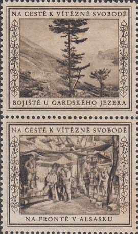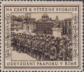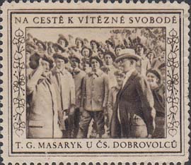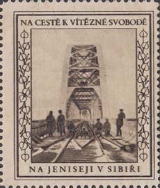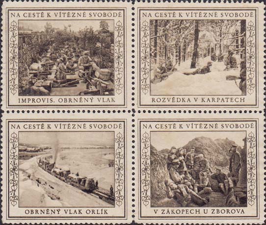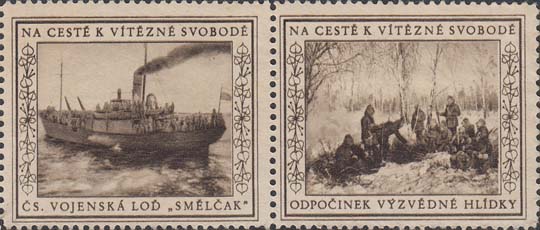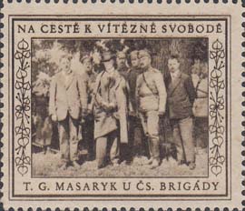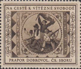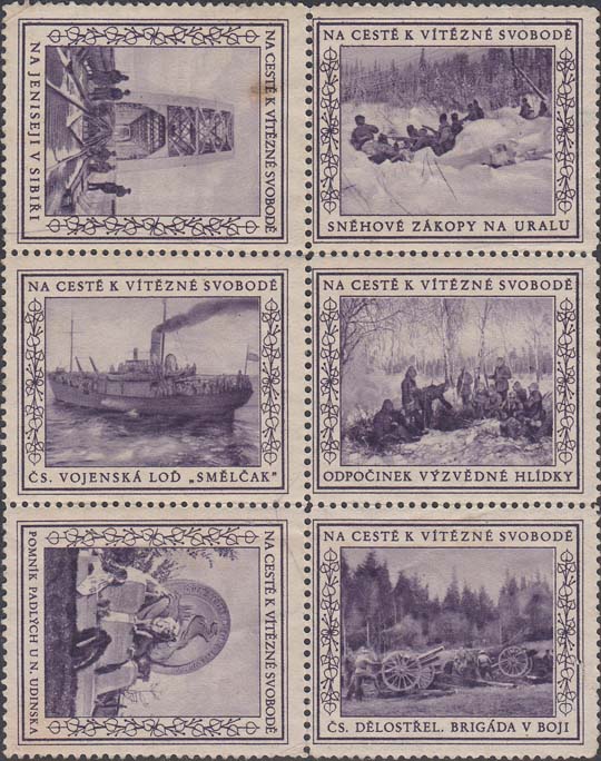 1927(?) г. Разм. рамки 42 х 35 мм или 35 х 42 мм. Одноцветная печать на желтоватой бумаге. Зубц. лин. 10 3/4 х 11 1/2. С клеем. В двойной прямоугольной рамке в центре репродукции различных фотографий из жизни чехословацкого корпуса. Сверху текст на чешском языке: "На пути с свободе". Внизу подписи к фотографиям на чешском языке.