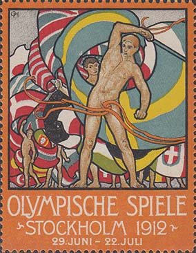 1912 г. Разм. рамки 44 х 44 мм. Многоцветная печать на белой бумаге. Зубц. 11 1/4. С клеем. В центре в прямоугольной рамке аллегорический рисунок: атлеты и флаги разных стран. Внизу текст в три строки на разных языках: "Олимпийские игры Стокгольм 1912 29 июня - 29 июля".