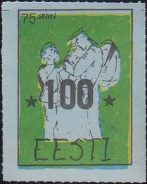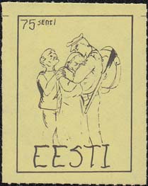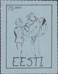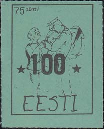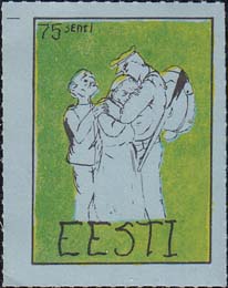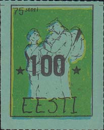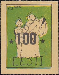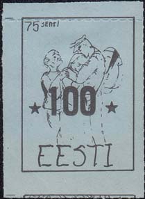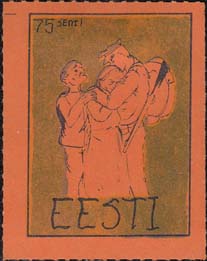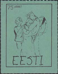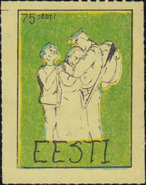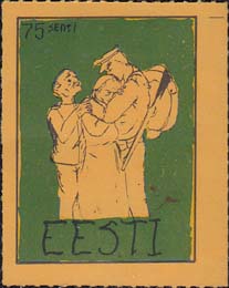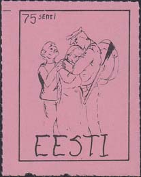 1980(?) г. Разм. по перфорации ≈ 34 х 45 мм. Одноцветная и многоцветная печать на бумаге различных цветов. Линейная просечка. С клеем. В прямоугольной рамке разм. 27 х 37 мм примитивный рисунок. Солдат прощается с семьей. В левом верхнем углу номинал. Внизу текст на английском языке: "Эстония".