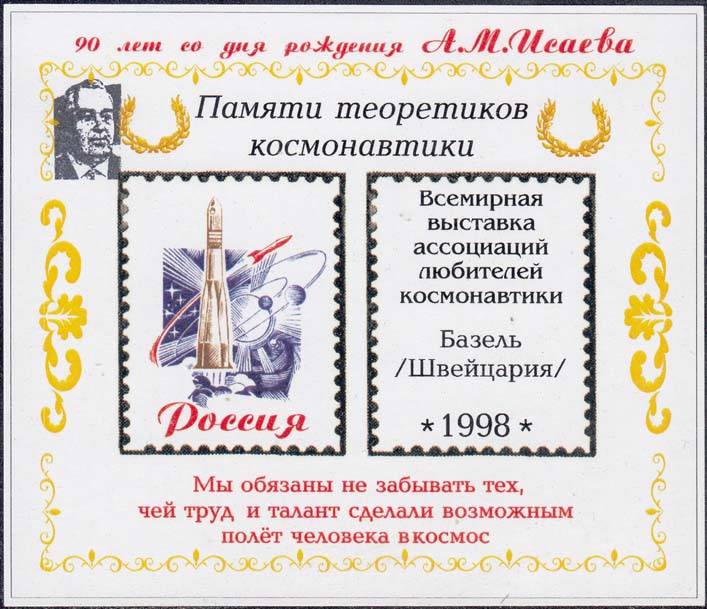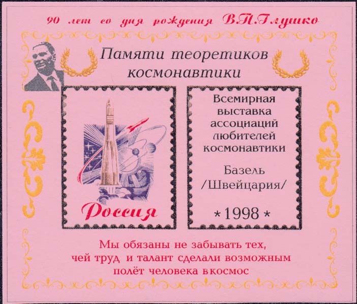1998 г. Разм. рамки 117 х 99 мм. Многоцветная печать на бумаге различных цветов и толщины. В прямоугольной декоративной рамке в центре стилизованное изображение двух виньеток. На одной из них стилизованное изображение планет и ракет. На другой текст в восемь строк: "Всемирная выставка ассоциаций любителей космонавтики Базель /Швейцария/. 1998". Сверху портреты советских ученых - теоретиков космонавтики и текст в две строки: "Памяти теоретиков космонавтики". Выше между рамками памятный текст. Внизу текст в три строки: "Мы обязаны не забывать тех, чей труд и талант сделали возможным полет человека в космос."
