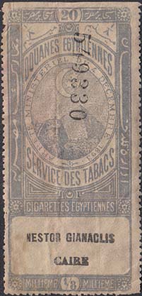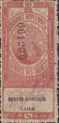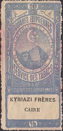 1893 г. Разм. рамки 30 х 68 мм. двухцветная печать на тонкой белой бумаге. Зубц 13 1/4. С клеем(?). В прямоугольной декоративной рамке в центре пирамиды и полумесяц с тремя звездами. тексты на английском, французском и арабском языках.