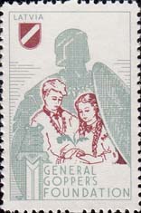 1965 г. Разм. рамки 23 х 36 мм. Двухцветная печать на белой бумаге. Зубц. 12 1/2. С клеем(?). В прямоугольной рамке в центре фигура в доспехах и двое детей. Название организации на латышском или английском языках.
