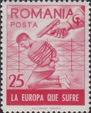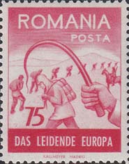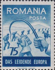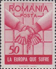 1959 г. Май. 15 лет со дня установления коммунистического террора в Румынии. Разм. рис. 28 х 35 мм. Одноцветная печать на белой бумаге. Зубц. 11 и Б.З. С клеем. В центре различные антикоммунистические сюжеты. Сверху текст в две строки на румынском языке: "Почта Румынии". В левом нижнем углу номинал. Внизу текст на испанском языке: "Страдающая Европа".