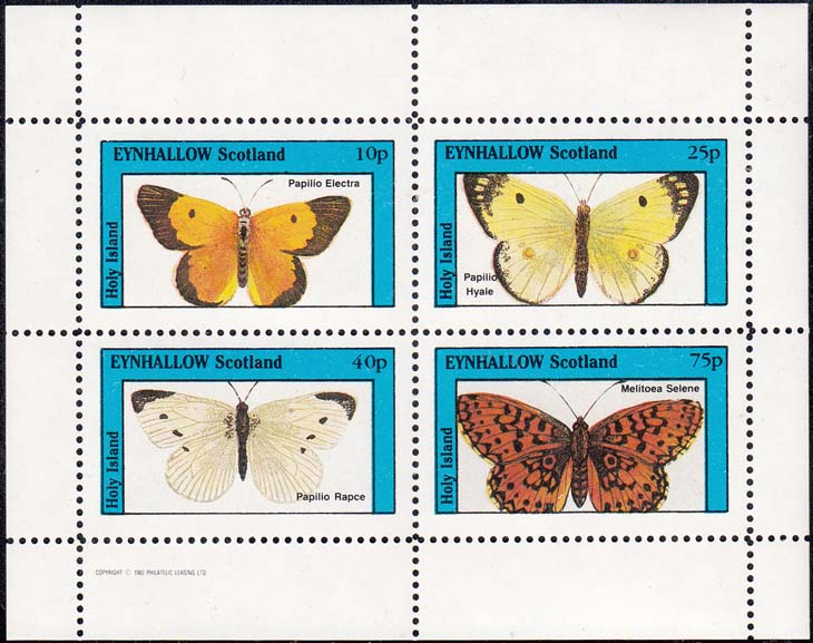 1982 г.   Разм. рис. 45 х 26 мм. Многоцветная печать на белой глянцевой бумаге. С клеем. В центре изображения бабочек различных видов. Тексты на английском языке.