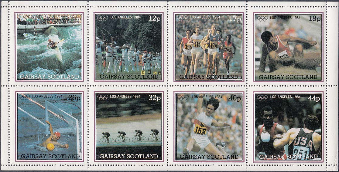 1984(?) г. Разм. рамки 38 х 39 мм. Многоцветная печать на белой бумаге. Зубц. 14. С клеем. В прямоугольной рамке в центре различные спортивные сюжеты. Сверху олимпийская символика и текст на английском языке: "Лос-Анджелес 1984". В правом верхнем углу номинал. Внизу текст на английском языке: "Gairsay Scotland".